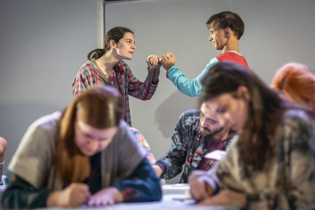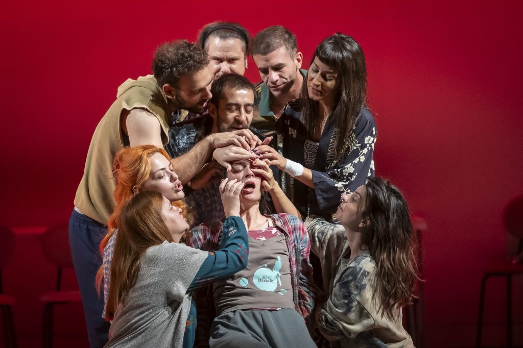 Popunjavanje scene predstavlja dakle kreiranje gotovo novog svijeta za tekst, u kojem će jedan psihijatrijski odjel zadržati svoju realističnu bjelinu, ostavivši je za dokumentarističko suočavanje sa intimnim ispovijestima, a opet je stilizacijom dovoljno uzdižući do univerzalnog prepoznavanja u tinjajućoj nadi za šarenilom novog života. Najbolji primjer nadogradnje ili izgradnje na osnovu već postojećih temelja, jeste uspostavljanje sveprisutnosti gotovo svih pacijenata koji će većinom raditi ono što se i radi u bolnicama, “ubijati” dosadu i čekati, nekoga, nešto. Međutim, to neće biti njihova jedina uloga, pa će oni istovremeno igrati i bolesti, odnosno one glasove koji su prouzrokovali njihova stanja, pa čak će igrati i vlastite usađene misli. Ako je prije ove predstave bilo teško i zamisliti kako izgleda napad panike, ti trenuci neizdrživog pritiska će se sada moći osjetiti na koži zahvaljujući pokretu za koji je bila zadužena Amila Terzimehić. U njima glasovi bolesnog društva isprva okružuju žrtvu, a onda postepeno postaju unutrašnje misli, a sa mislima se najteže suočiti, posebno dok dišu za vratom i migolje prstima po licu, pa čak i ako “govore” istinu. Jedino što preostaje jeste vrisak ili bacanje na pod.