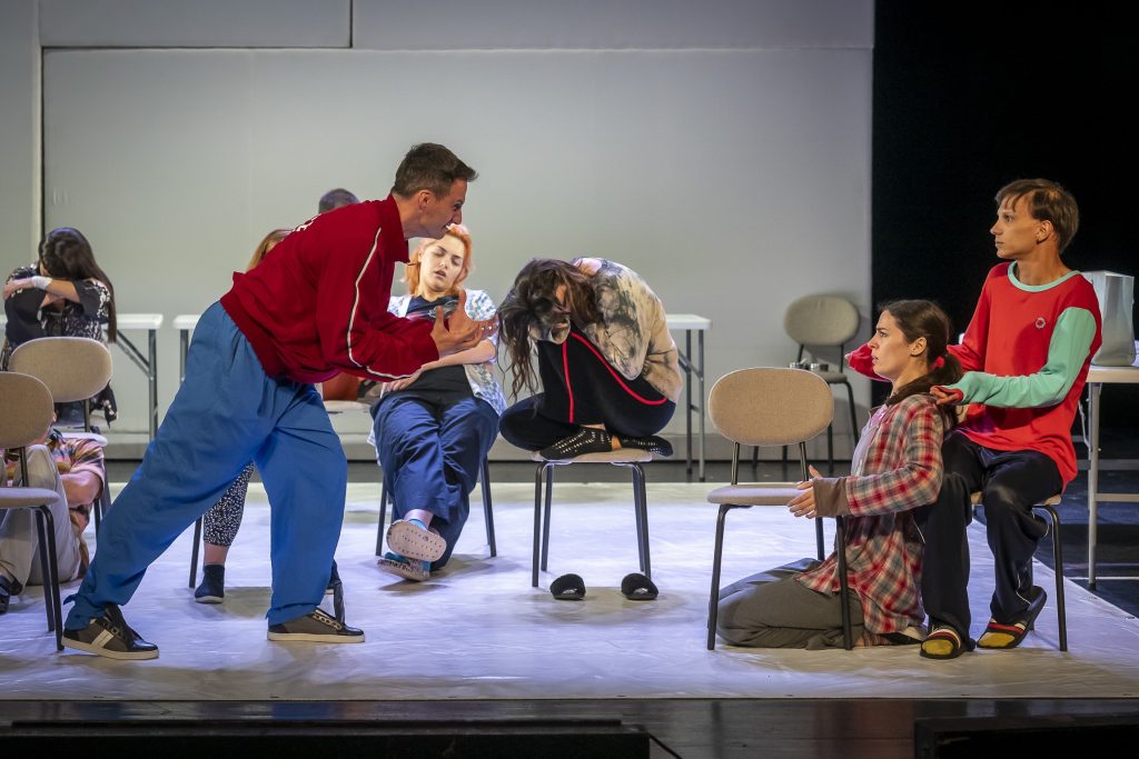 Rediteljica je prvo ispunila praznu scenu, stolicama, likovima, njihovim pojedinačnim kostimografskim bojama koje je sugestivno posložila Lejla Hodžić, unijevši dovoljno života u bjelinu prostora jedne zdravstvene institucije i naslutivši mogući kraj, a opet u potpunosti zadržavši ogoljenost prostora u kojem se nemoguće sakriti. Šarenilo njihovih majica, trenerki, košulja, zapravo otkriva boje njihovih unutrašnjosti, boje koje su napolju izblijedile, oslabile, koje je okrutni vanjski svijet zaprljao, poderao, ali čiju raznolikost je nemoguće umrtviti. Nasuprot njih su bijeli mantili koji “pokrivaju” vanjsku hladnoću i lažnu ravnodušnost, jer u jednoj psihijatrijskoj bolnici teško je ne pronaći čovjeka u sebi, pa u tome neće uspijeti ni Doktorica (igra je Ejla Bavčić Tarakčija), ni Medicinski tehničar (igra ga Mak Čengić).